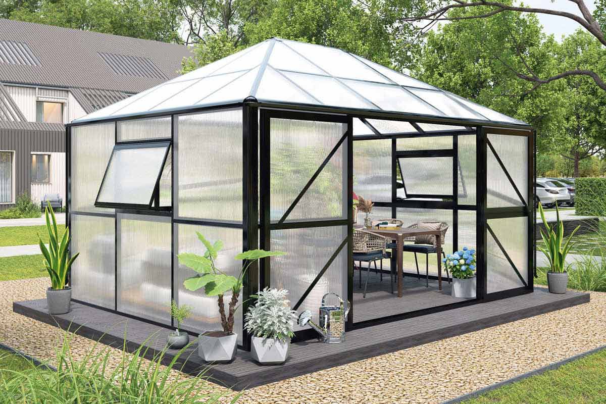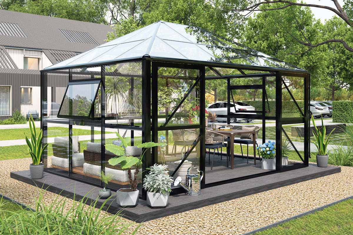 Sind Sie auf der Suche nach einem großzügigen, eleganten Gewächshaus? Dann ist unser Modell Basilikum genau das Richtige für Sie. Dieses Gewächshaus lässt sich flexibel erweitern und eignet sich auch perfekt als stilvoller Wintergarten. Serienmäßig ausgestattet mit Dachfenstern, Regenrinnen und Fallrohren, vereint es elegantes Design mit hochwertigen Materialien – ideal für alle, die hohe Ansprüche an Ästhetik und Funktionalität stellen.
