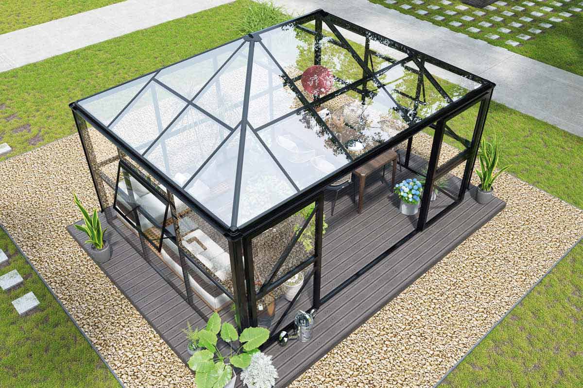 Verglasung: Kunststoffglas 10 mm (Hohlkammerprofil) oder Echtglas 4 mm