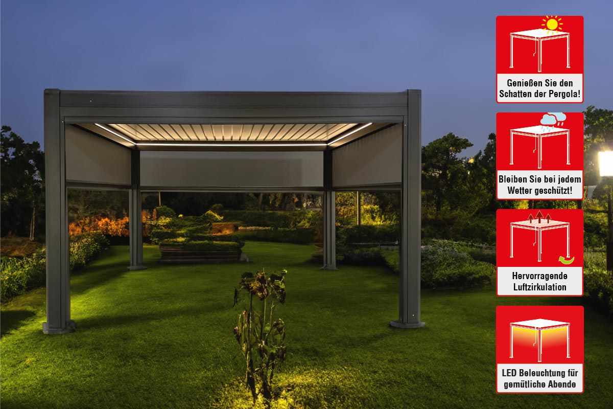 Erleben Sie die perfekte Kombination aus Stil und Komfort mit unserer Pergola Dallas in edlem Anthrazit. Diese hochwertige Pergola ist nicht nur ein Hingucker in jedem Garten oder auf jeder Terrasse, sondern bietet auch erstklassigen Schutz und vielseitige Nutzungsmöglichkeiten. Gestalten Sie Ihren Außenbereich zu einem Wohlfühlort mit der Pergola Dallas. Genießen Sie Schutz vor Sonne und neugierigen Blicken, während Sie die Abende unter der stilvollen LED-Beleuchtung ausklingen lassen. Erleben Sie Qualität und Design in einer neuen Dimension – mit der Pergola Dallas.